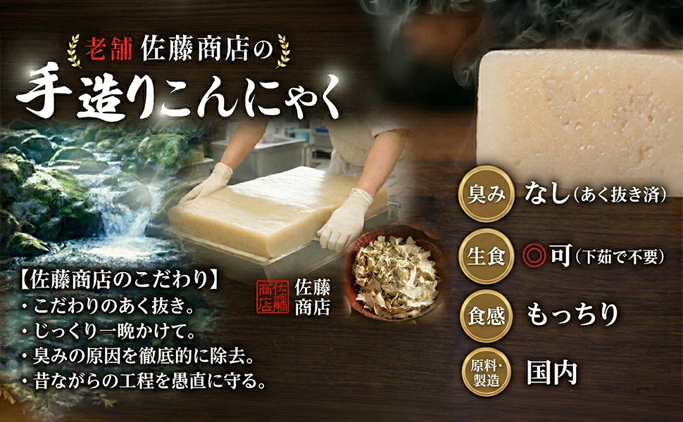 「こんにゃくの臭みが苦手…」そんな方にこそ食べていただきたい、職人手造りの逸品です。大分県由布市の湧き水を使い、昭和40年代から変わらぬ伝統製法で仕込みました。出荷まで丸2日をかけることで、こんにゃく特有の臭みを徹底的に取り除いています。